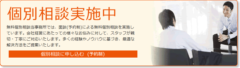 当事務所では、面談(予約制)による個別相談を実施しています。会社経営にあたっての様々なお悩みに対して、スタッフが親切・丁寧にご対応いたします。多くの経験やノウハウに基づき、最適な解決方法をご提案いたします。